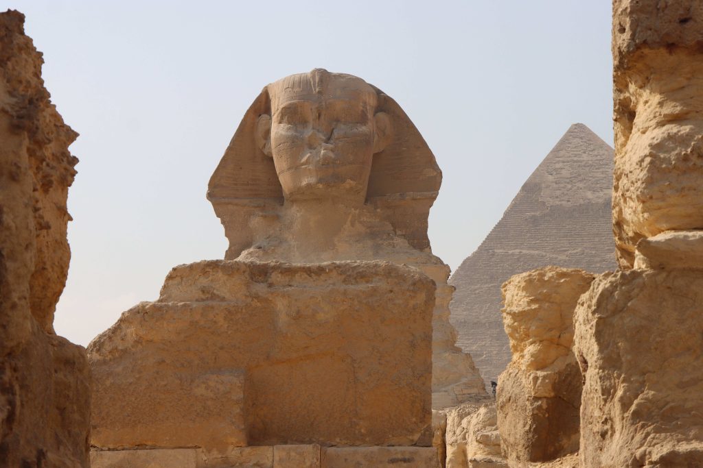 Les célèbres pyramides de Khéops, Khéphren et Mykérinos qui vous surplombent de toute leur grandeur. Elles sont gardées par le célèbre Sphinx en contre-bas du plateau.